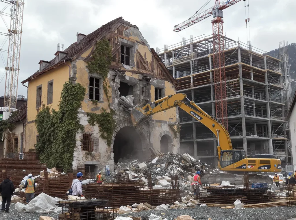 Comptez entre 600 et 900 CHF par mètre carré pour une démolition complète, incluant l’évacuation des gravats et le désamiantage si nécessaire. La construction neuve coûte ensuite entre 3’000 et 4’500 CHF par mètre carré selon les finitions.